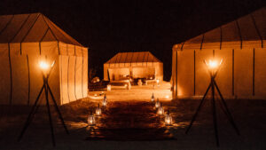 Take pictures of your party with splendid views of the often-snow-covered mountains of the High Atlas. Enjoy a sunset camel ride and a relaxing glass of tea. Lunch in the most charming spot in the Agafay desert.
