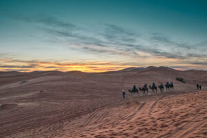 Departure from your hotel in Dades gorges after a typical Moroccan breakfast. Taking the road of 1000 Kasbahs driving around the colorful Berber villages of Dades valley. 45 km further, you will get to Tineghir. It is famous by its beautiful palm groves and Jewish quarter. While arriving Todra gorges (Todgha) its free time to go on trek along the canyons about 300 m high. It’s a preferred place by mountain climbers. Afterwards you will leave to Erg Chebbi dunes in Merzouga Sahara desert. Then it’s free time for lunch on the way before you arrive to Erfoud. Once you arrive to the dunes of Erg Chebbi, you will take a camel ride for 1h30 at the sunset to get to the oasis where the camp is located. Spend the night in the bivouac in Merzouga Sahara dunes under nomadic tents or outside under shooting stars. Play drums with the camel drivers. Dinner and overnight in Merzouga Sahara desert camp.